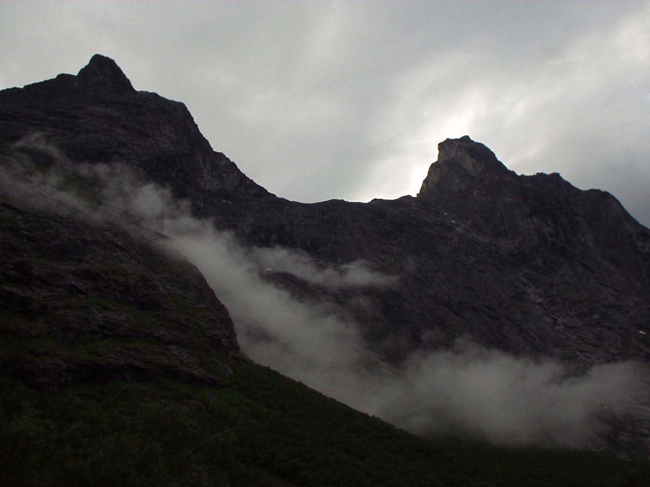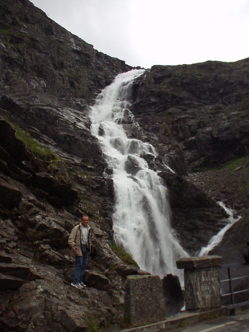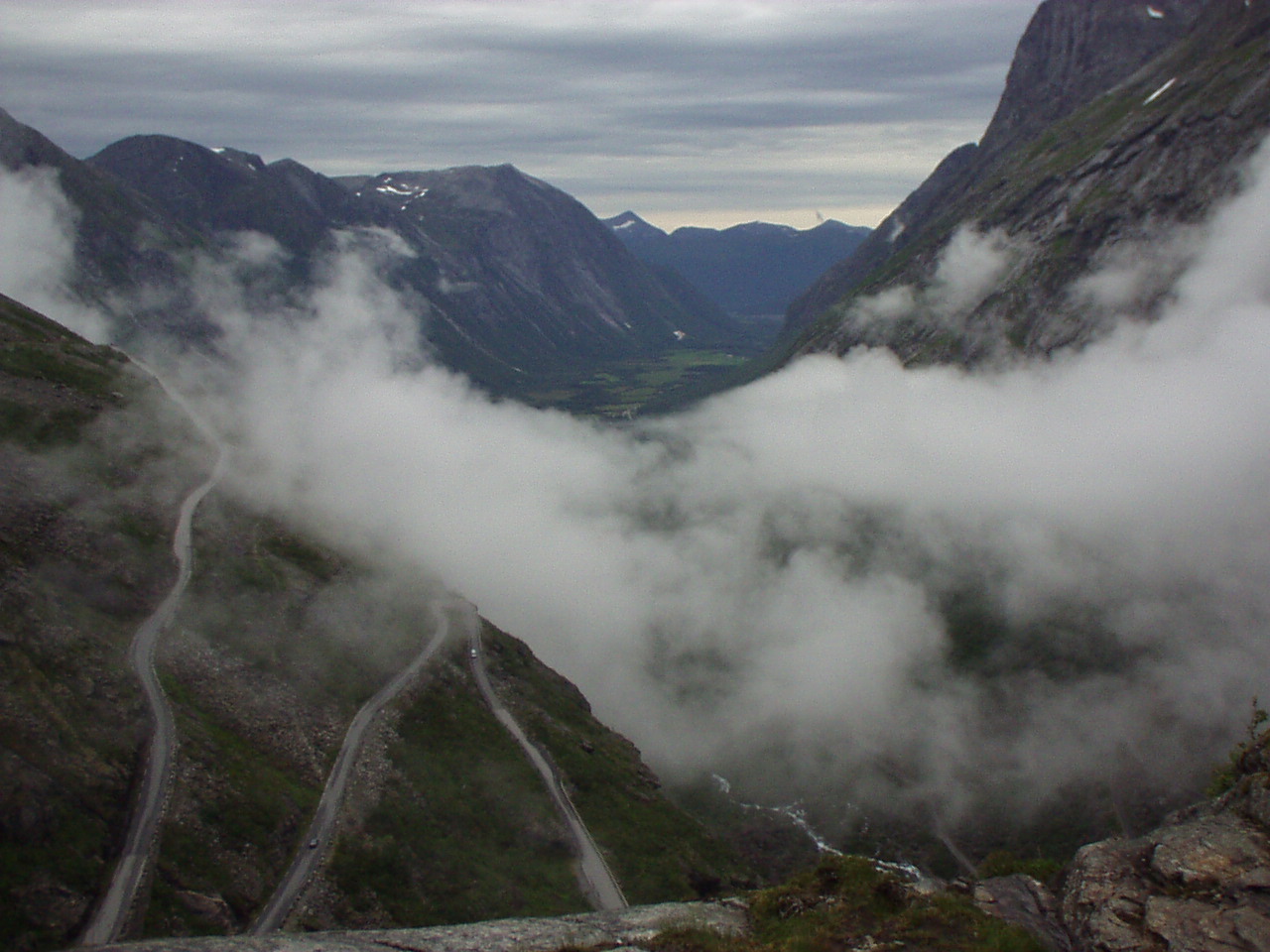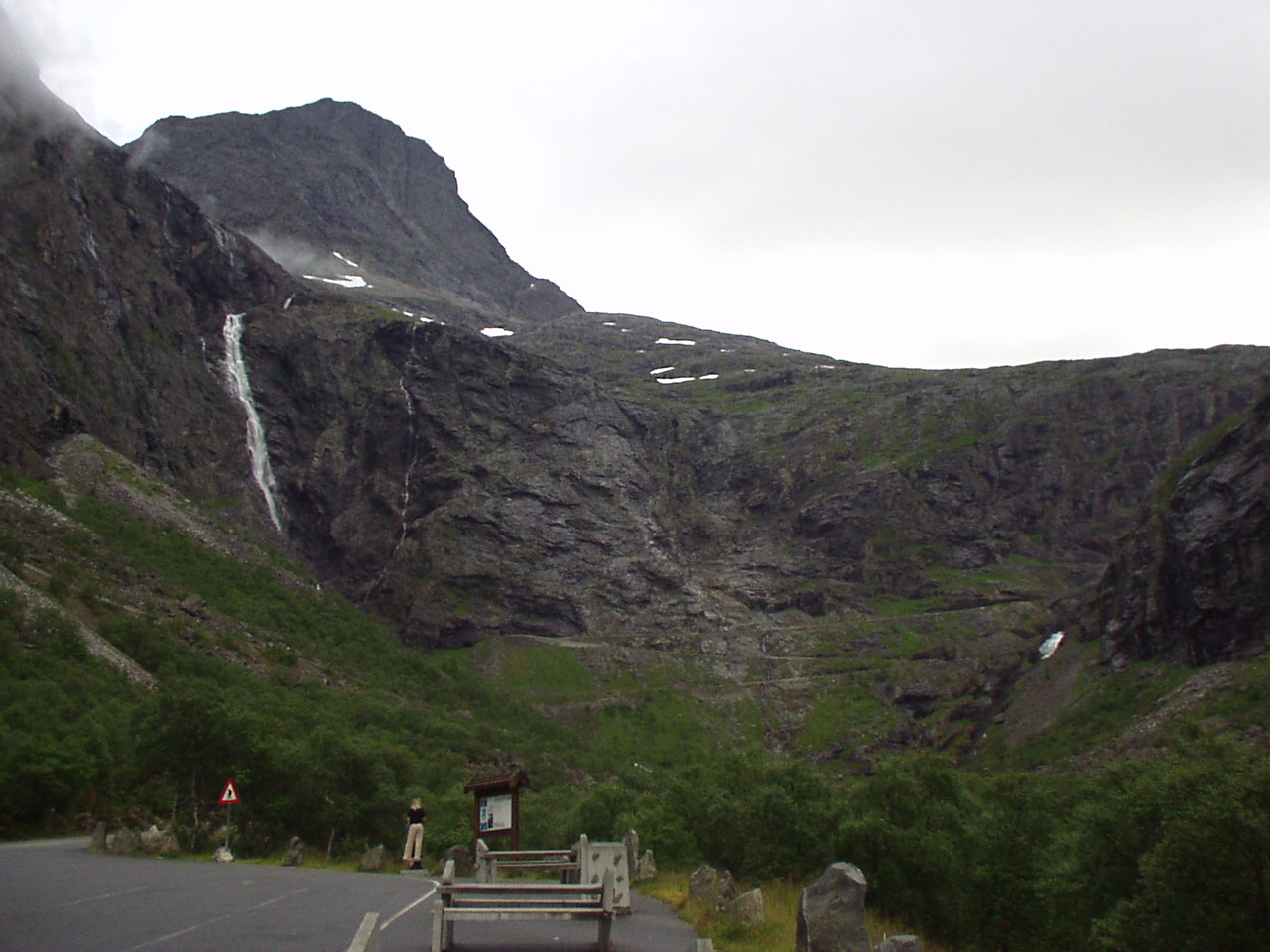 Appena piantate le tende riprendiamo la nostra moda del turismo serale, imboccando la strada per il Trollstigenpass. La valle ci si chiude davanti e non si vede uscita. D'improvviso poi la strada inizia ad arrampicarsi tornante dopo tornante sulla parete, come appesa a due cascate che la delimitano a destra e a sinistra. Non sembra un lavoro di uomini, ed è per questo che viene chiamata la "salita dei troll", come se fosse stata realizzata da queste strane creature mitologiche.