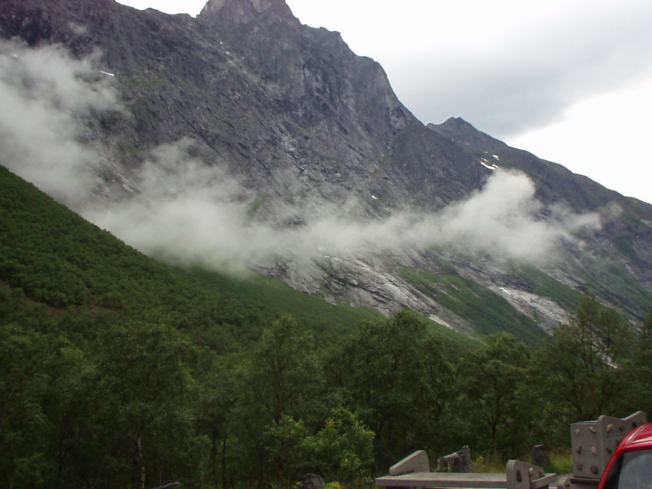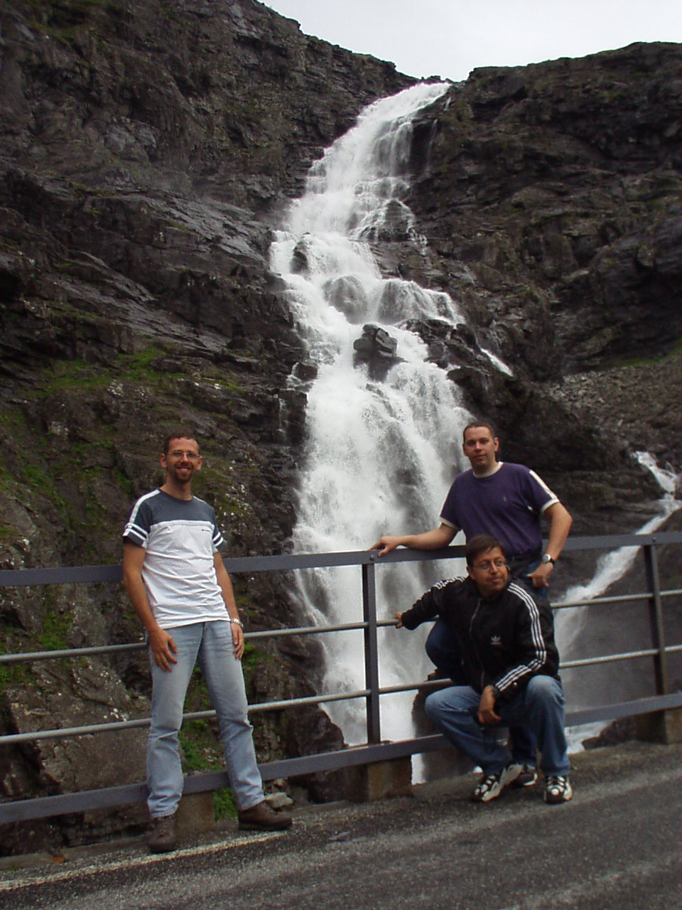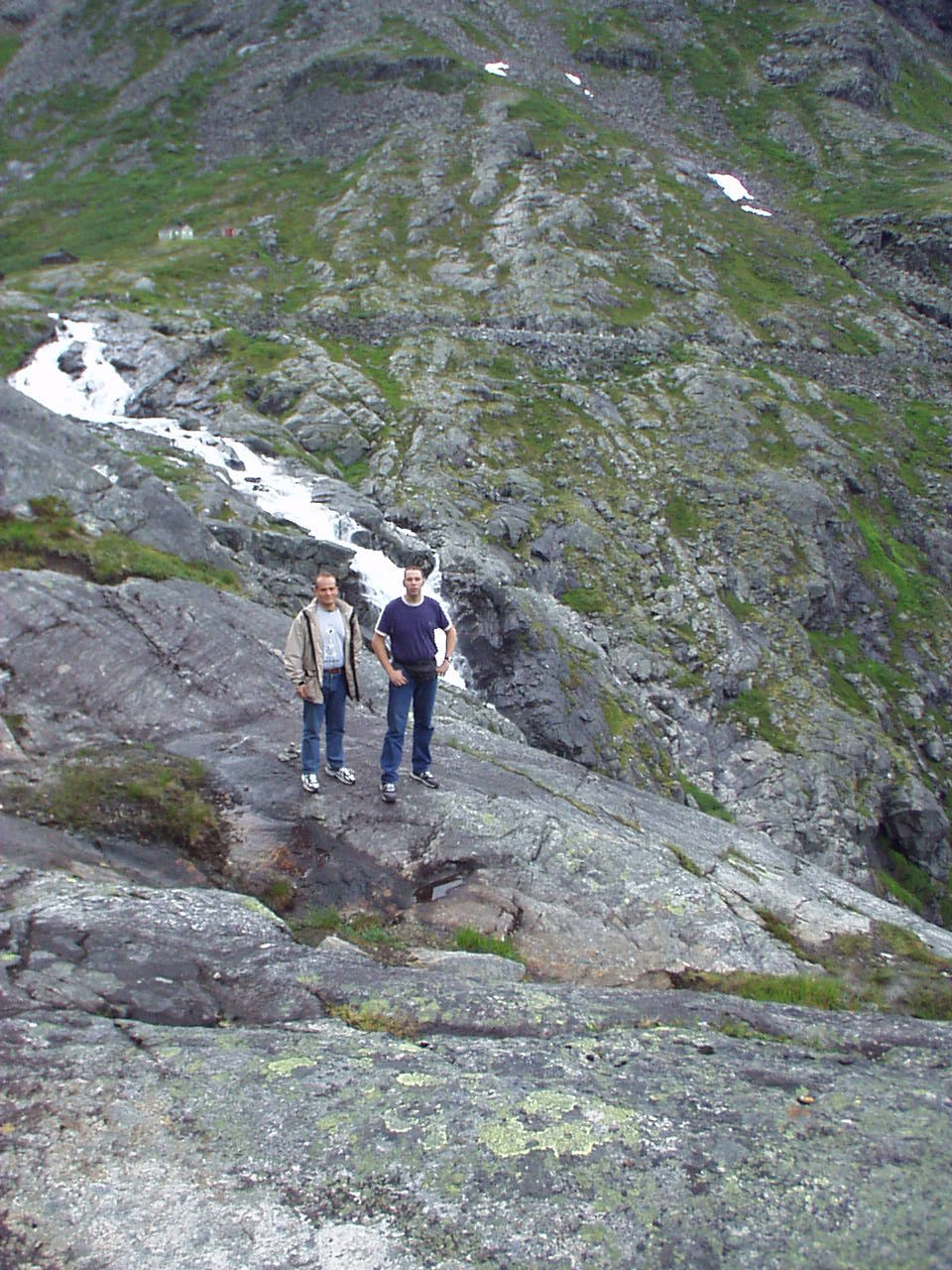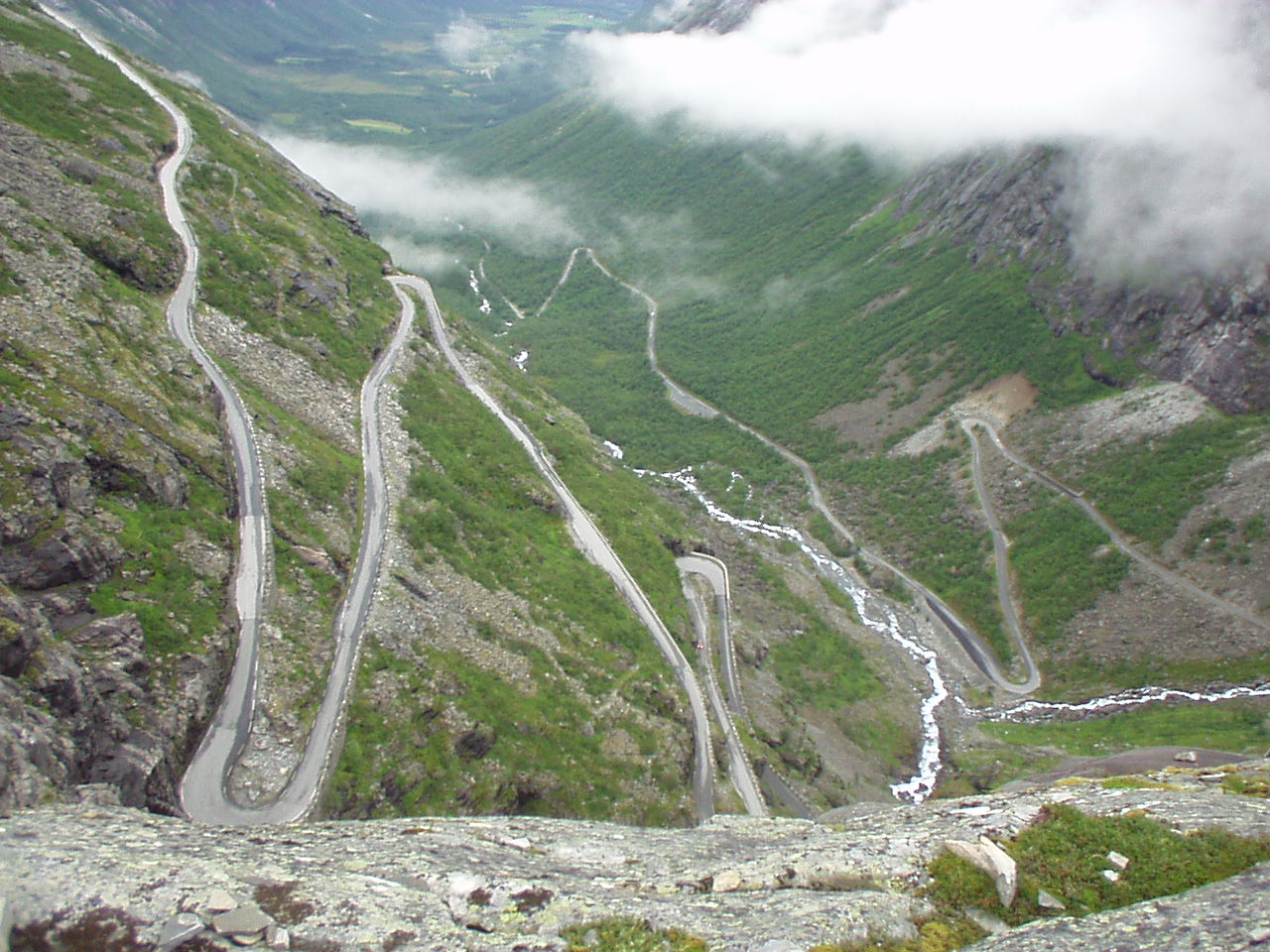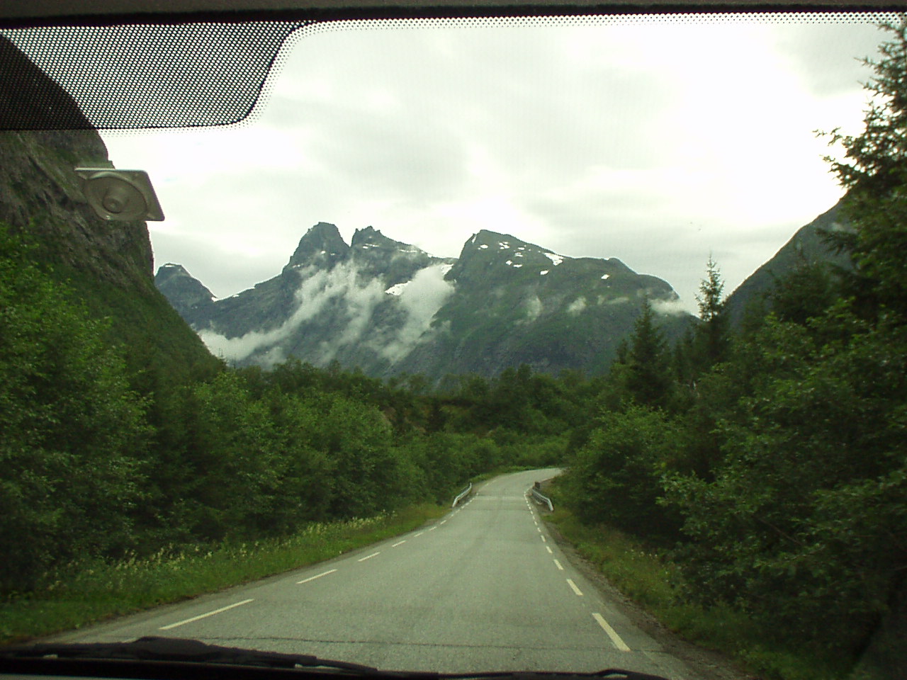 Appena piantate le tende riprendiamo la nostra moda del turismo serale, imboccando la strada per il Trollstigenpass. La valle ci si chiude davanti e non si vede uscita. D'improvviso poi la strada inizia ad arrampicarsi tornante dopo tornante sulla parete, come appesa a due cascate che la delimitano a destra e a sinistra. Non sembra un lavoro di uomini, ed è per questo che viene chiamata la "salita dei troll", come se fosse stata realizzata da queste strane creature mitologiche.
