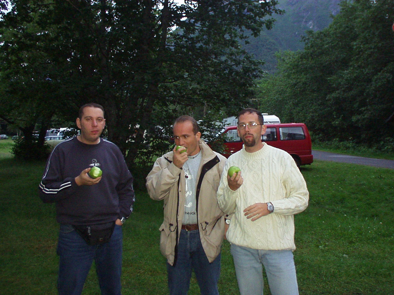 Tornati al camping organizziamo una cena in piedi (in mancanza di sedie...) terminata come d'abitudine con una bella mela. Non abbiamo voluto un allaccio alla corrente elettrica, contando di ricaricare il pc dai bagni (come clandestini). L'ipotesi non è attuabile, dato il traffico di gente che entra e che esce. Scatta il piano B, che prevede vampirismo da pub. Ci prendiamo una birra e giochiamo a tresette, giusto il tempo di fare il pieno (cioè un'ora oltre l'orario di chiusura).