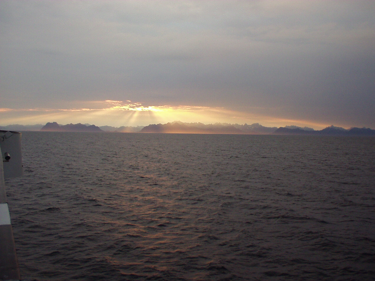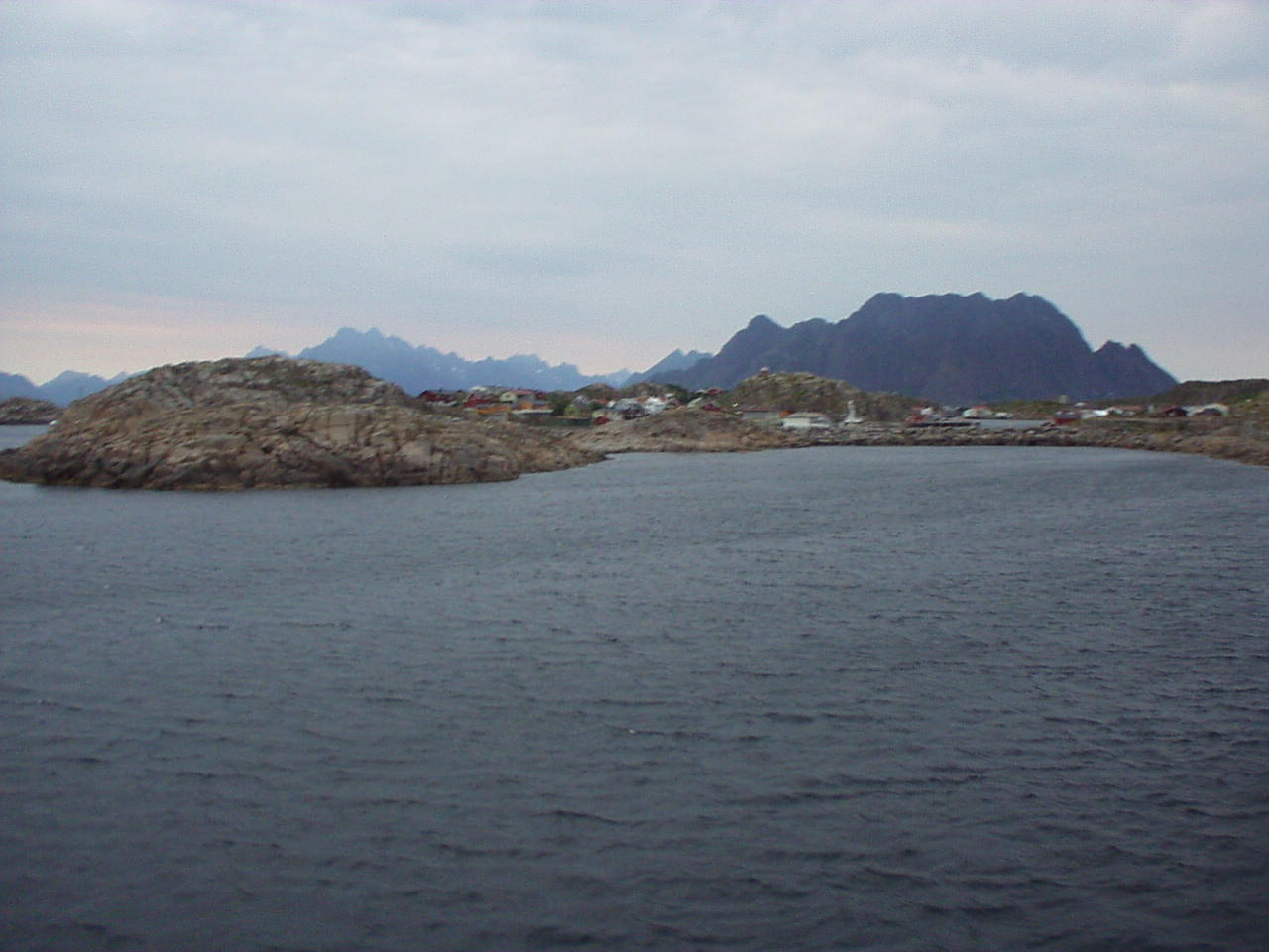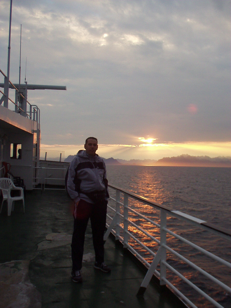 Lo spettacolo dal ponte superiore è magnifico. Non piove più, il mare è calmo (solo il vento teso è fastidioso). Verso ovest le isole Lofoten (la Sardegna della Norvegia), brillano alla luce del sole che compare al di sotto delle nuvole. Passiamo dal ponte coperto a quello superiore diverse volte, tentando inutilmente di farci rivolgere la parola da un ragazzo torinese, che però rimane sulle sue. Era andata così anche stamattina con un motociclista milanese incontrato ad un benzinaio (?, dobbiamo avere un brutto aspetto...).