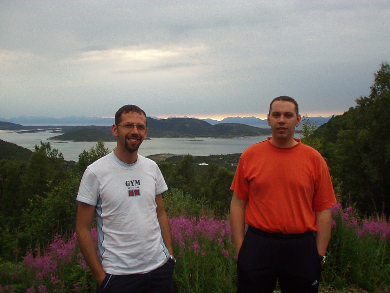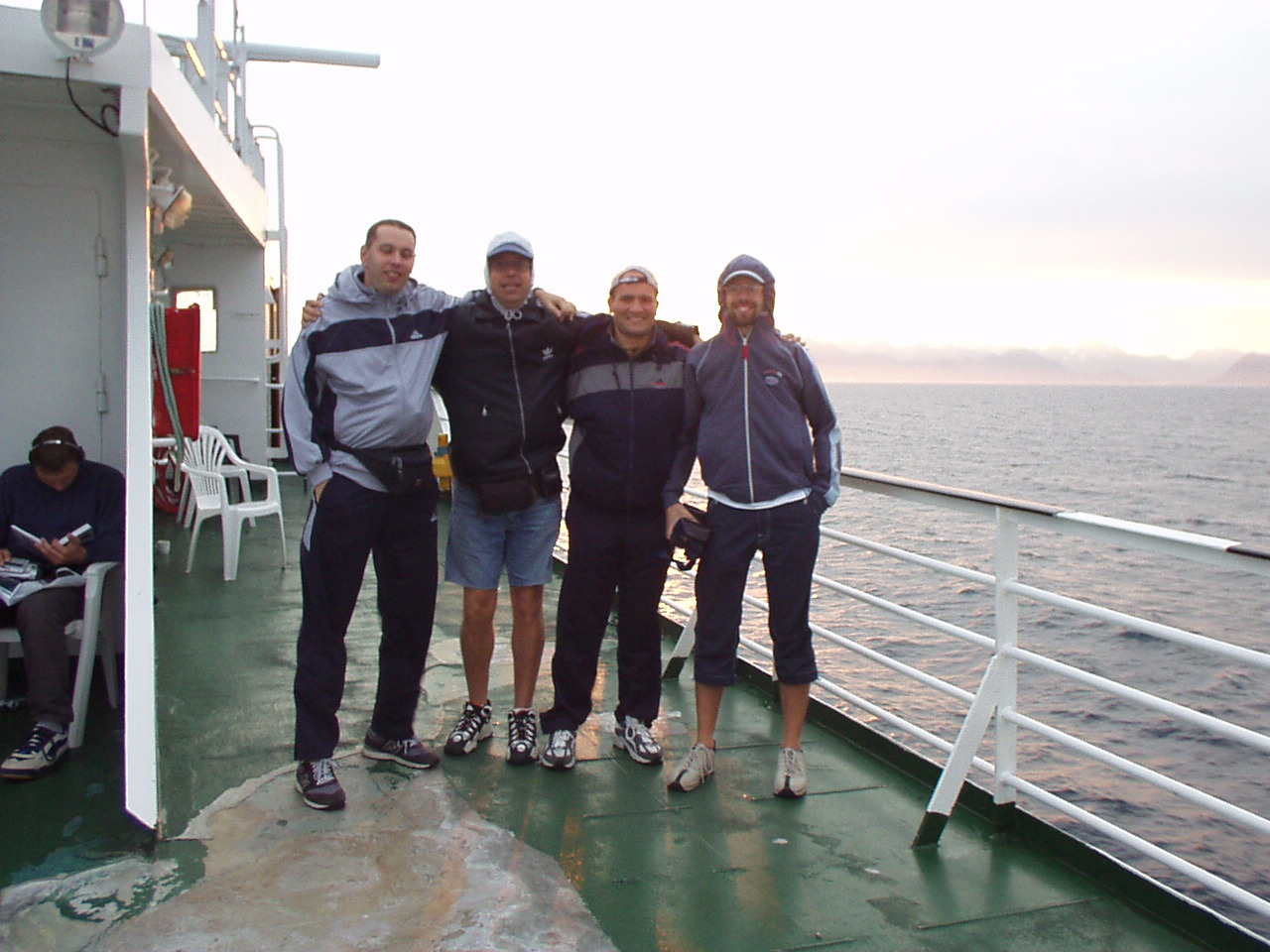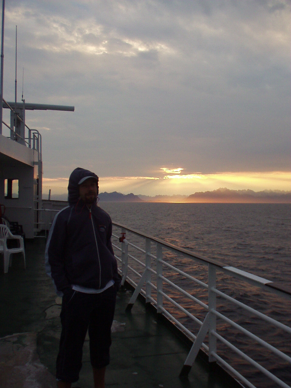 Lo spettacolo dal ponte superiore è magnifico. Non piove più, il mare è calmo (solo il vento teso è fastidioso). Verso ovest le isole Lofoten (la Sardegna della Norvegia), brillano alla luce del sole che compare al di sotto delle nuvole. Passiamo dal ponte coperto a quello superiore diverse volte, tentando inutilmente di farci rivolgere la parola da un ragazzo torinese, che però rimane sulle sue. Era andata così anche stamattina con un motociclista milanese incontrato ad un benzinaio (?, dobbiamo avere un brutto aspetto...).