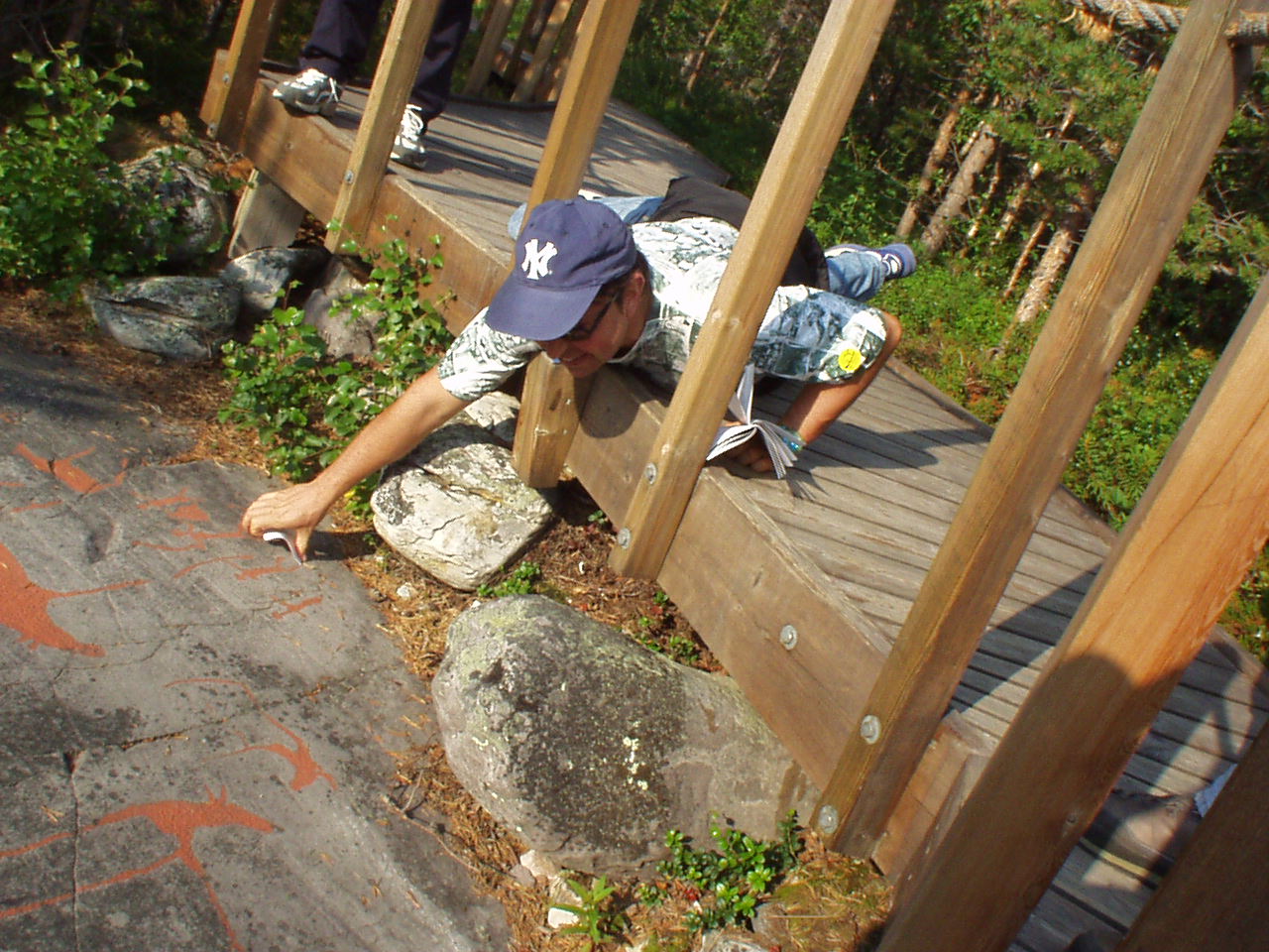 Quel che ci interessa sono i graffiti, che visitiamo con calma ed attenzione, seguendo le indicazioni dello stampato (in italiano) che ci hanno dato all'ingresso. Ci sorprendiamo, perché lungo il tracciato riconosciamo distintamente figure graffite che non vengono riportate né sul depliant, né sul terreno. O sono ciechi (e noi geni), o è stato scelto di mettere in risalto solo parte dei segni (soprattutto quelli che vanno a formare grossi quadri d'insieme). Ale dimostra di avere la mentalità troglodita, riconoscendo i disegni (non sempre di facile interpretazione) senza l'ausilio della guida.