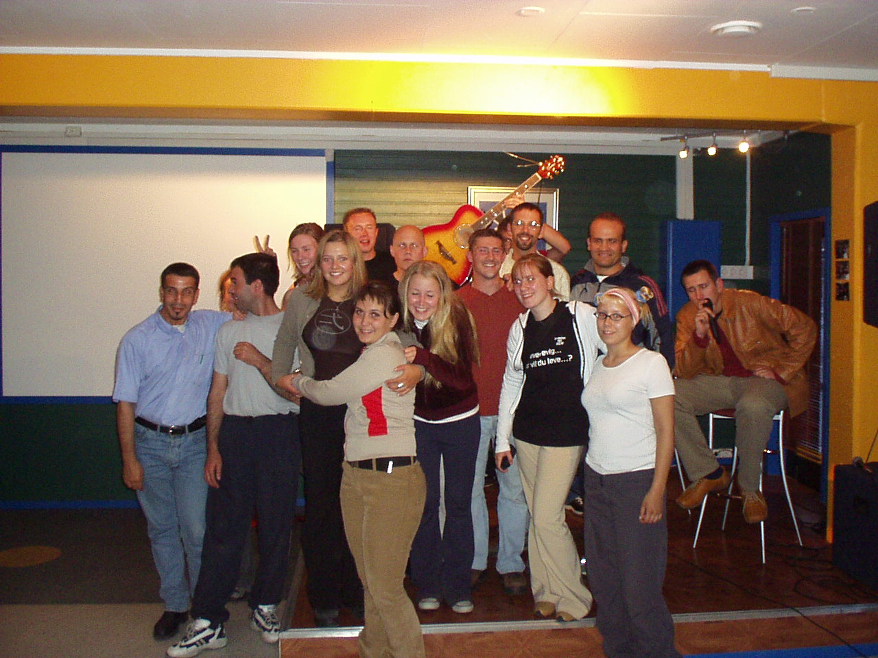 Entriamo mentre un giovane parla accoratamente dal piccolo palco, in un angolo del locale. Ci bastano due occhiate e tre secondi per vedere tutto quello che non avevamo visto al primo approccio: Un quadro con una colomba , un altro con una croce, la maglietta di superman che in realtà ha su scritto jeSus, e come se non bastasse una scritta in caratteri cubitali sulla porta: DU.ER.ELSKA.AV.GUD (Tu sei amore di Dio, si direbbe). SIamo in una sorta di oratorio, e il ragazzo che parla è un giovane predicatore evangelico. Per quel che riusciamo a capire il discorso è interessante (in realtà tutte cose già sentite), ma a rendere grottesca la situazione è la presenza di un gruppetto di ragazzi nordafricani, che ascoltano con l'aria di chiedersi reciprocamente "ma davvero questo qua pensa di convertirci così, con due parole?". Inizia anche la musica (di argomento religioso, molto piacevole).