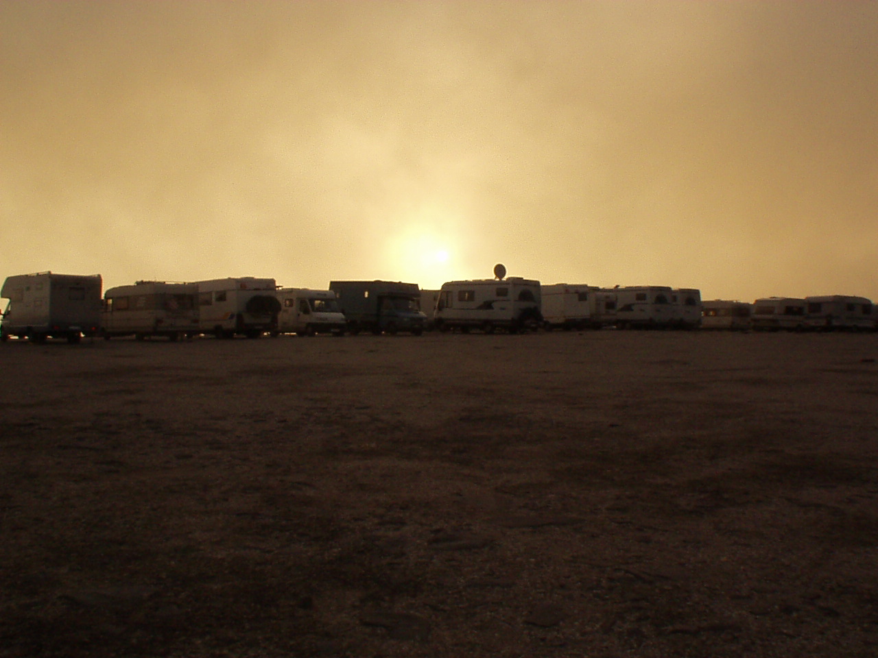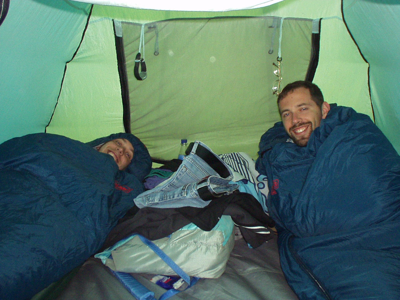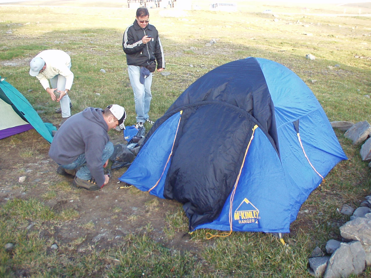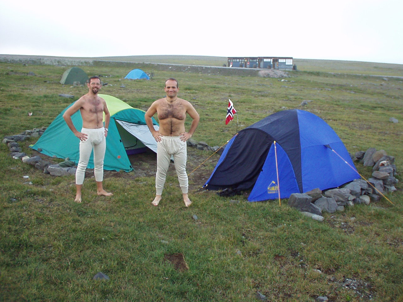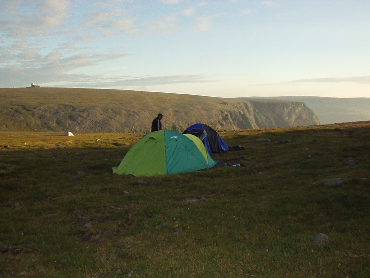 Appena entrati decidiamo immediatamente di darci al campeggio libero (consentito), per cui piantiamo le tende al di fuori dell'area-parcheggio, in buona posizione. Quando ci installiamo c'è solo una tenda, a duecento metri da noi. In seguito ne contiamo solo altre tre o quattro. La tenda più vicina a noi è di una coppia di motociclisti toscani. Prima di andarcene in giro celebriamo il solenne rito della cena polare (Ale è particolarmente contento perché oggi Pippo non ha comprato la crema al gusto di mela e olive).