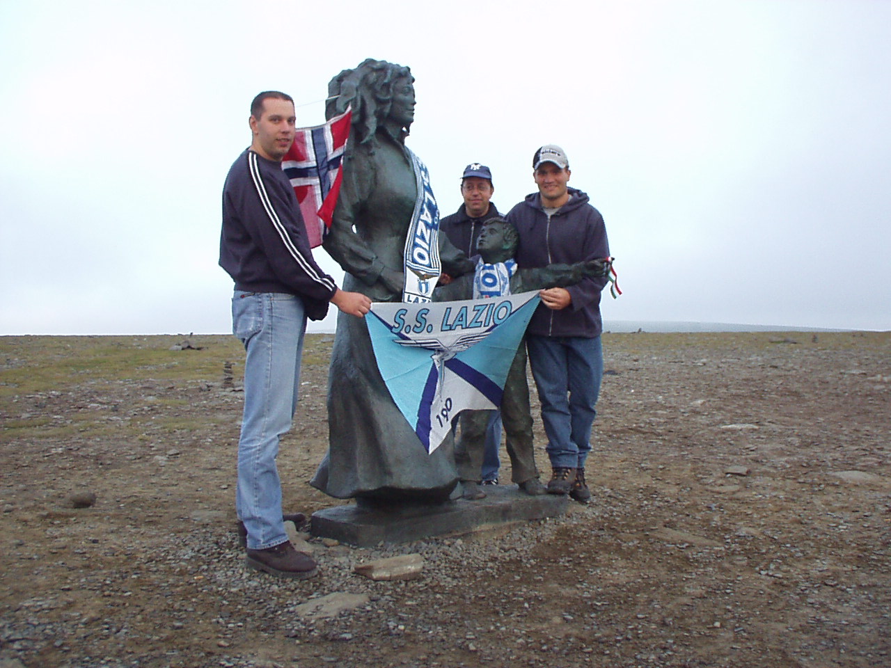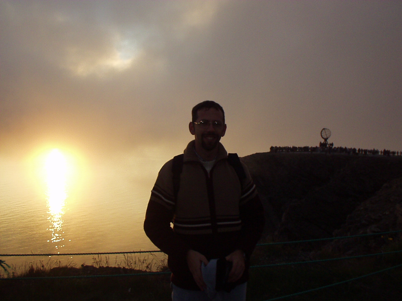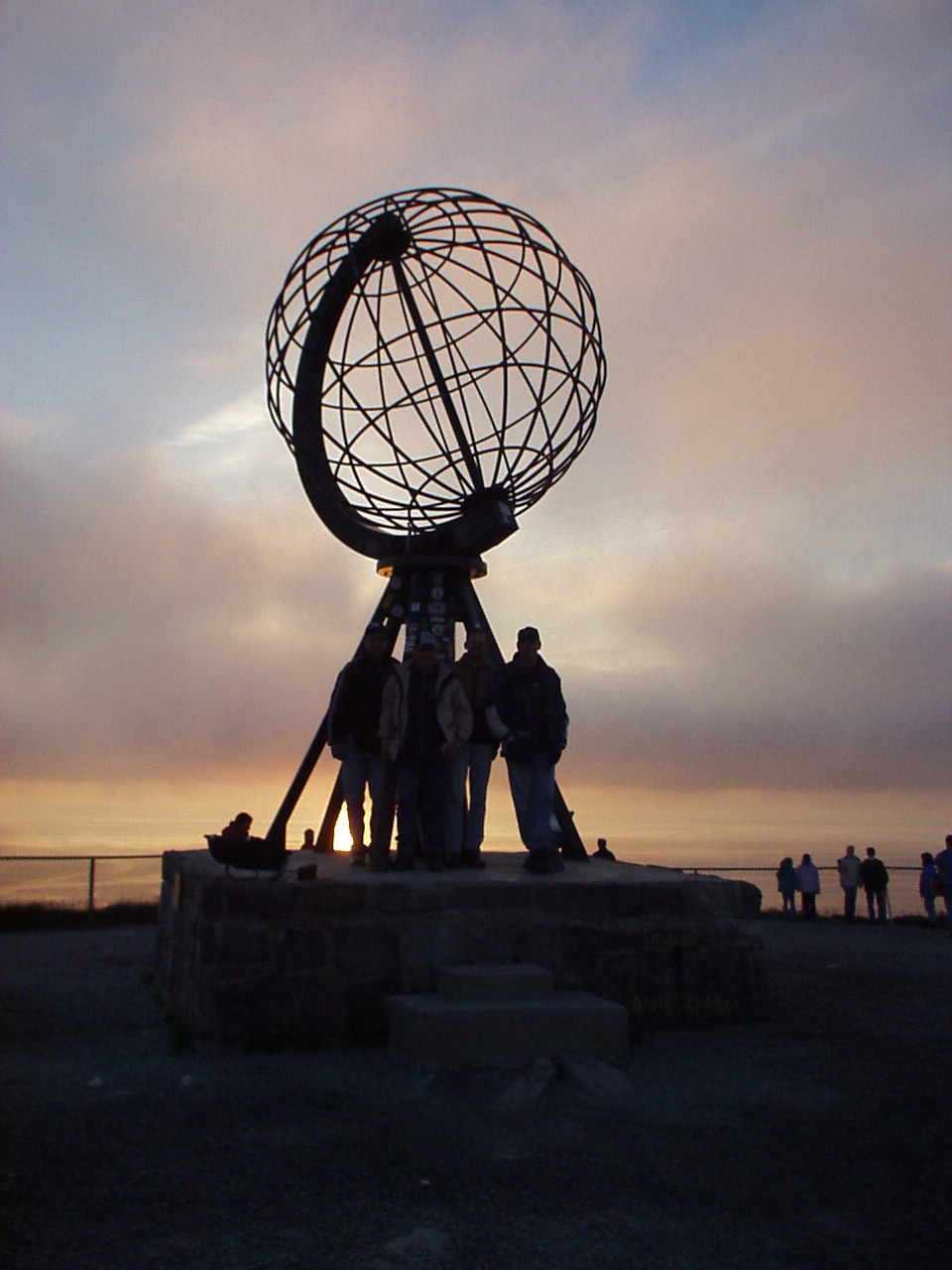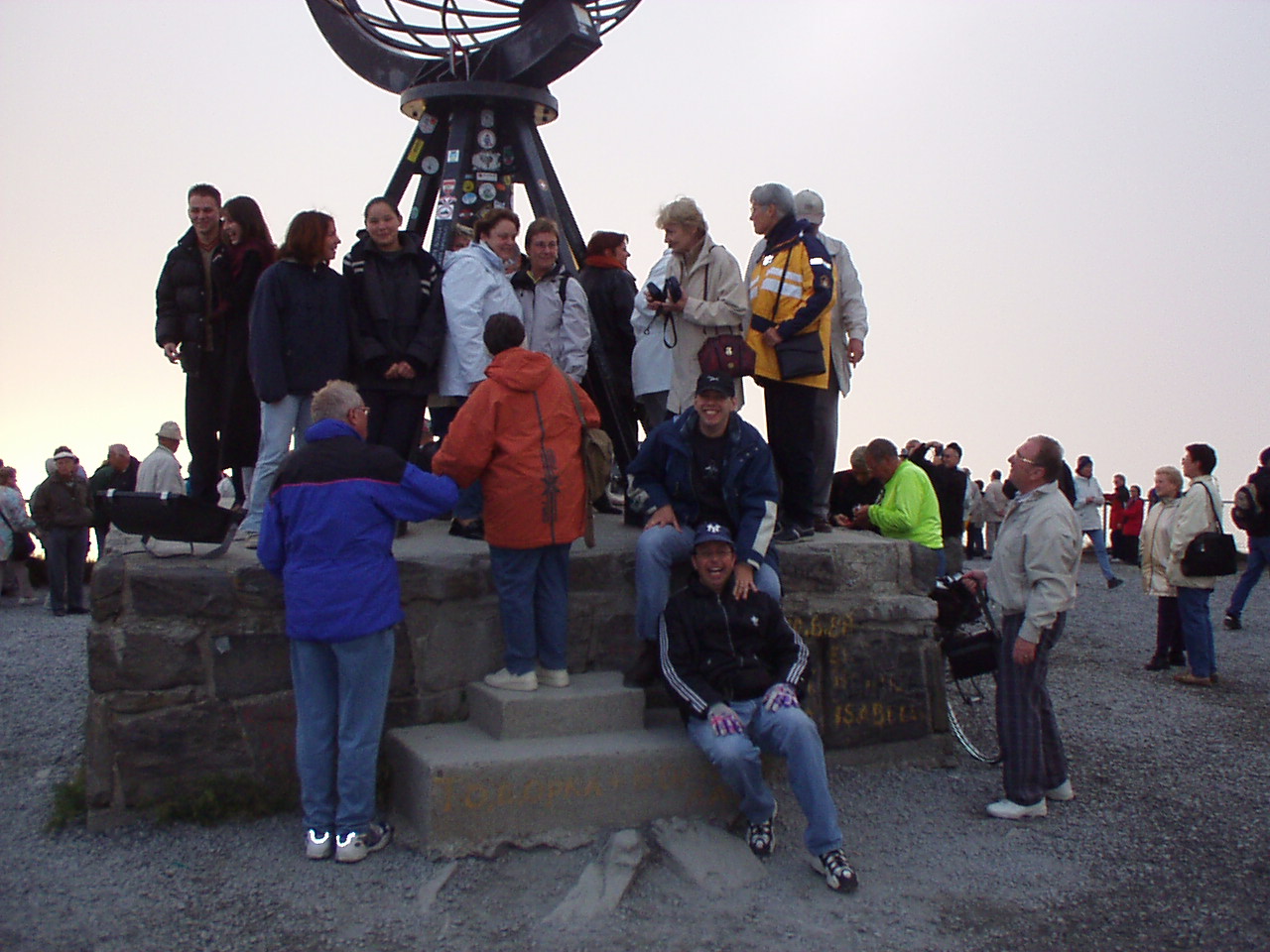 Il cielo è sereno, ma basse nuvole all'orizzonte compromettono una buona visione del sole di mezzanotte. Speriamo che si alzino in tempo... Intanto impazzano i turisti dei pullman, fino alla mezzanotte, poi il piazzale si svuota e rimangono solo quelli che hanno deciso di passare qui la notte. L'aria è piuttosto fresca (eufemismo). Gianfranco sfoggia guanti di pile viola, Ale non ha la giacca a vento né il k-way (né gli occhiali da sole, che paradossalmente non sono del tutto inutili a quest'ora, a queste latitudini). Pippo e Pierluigi sono meglio attrezzati e si fanno notare di meno.