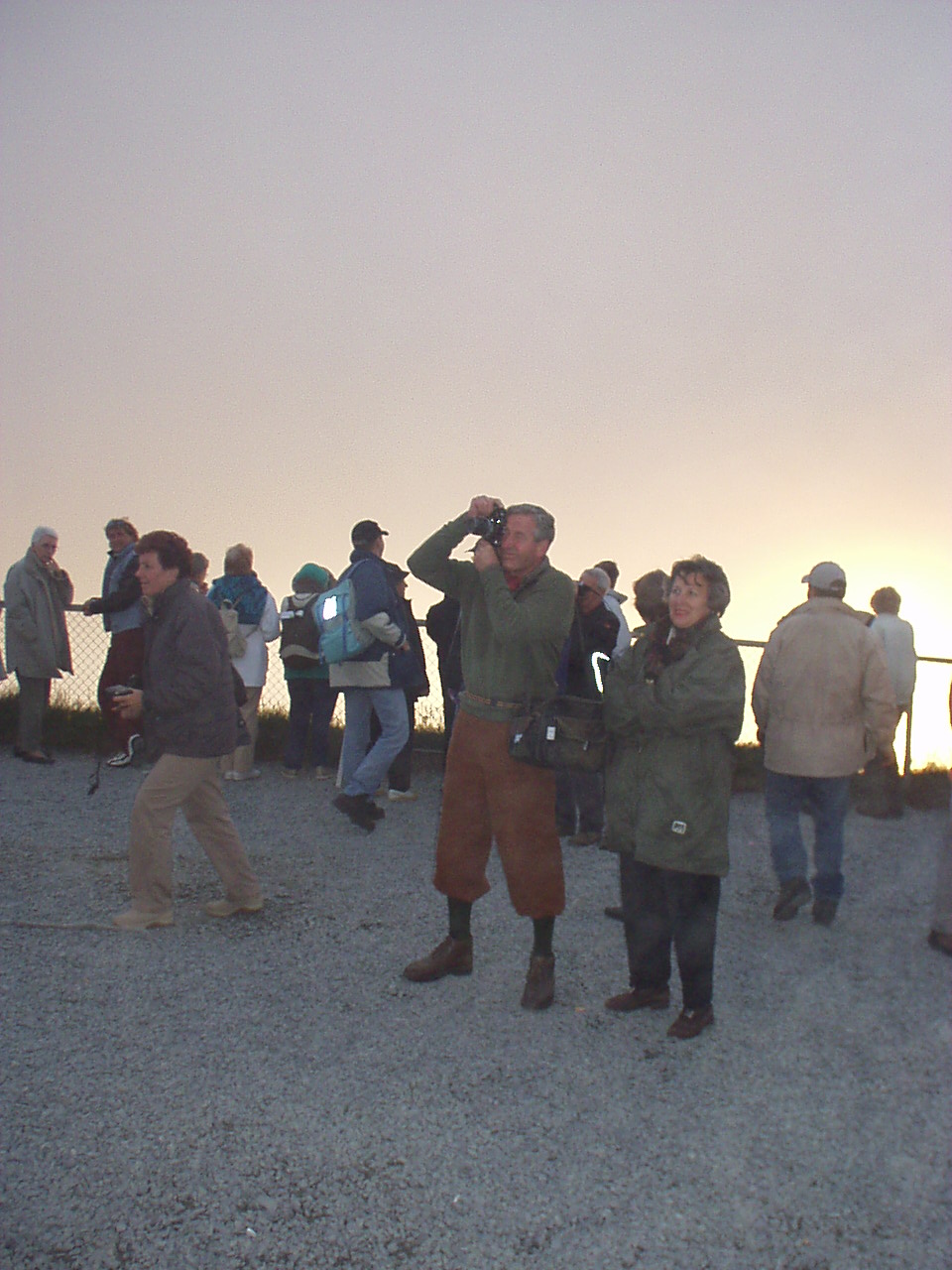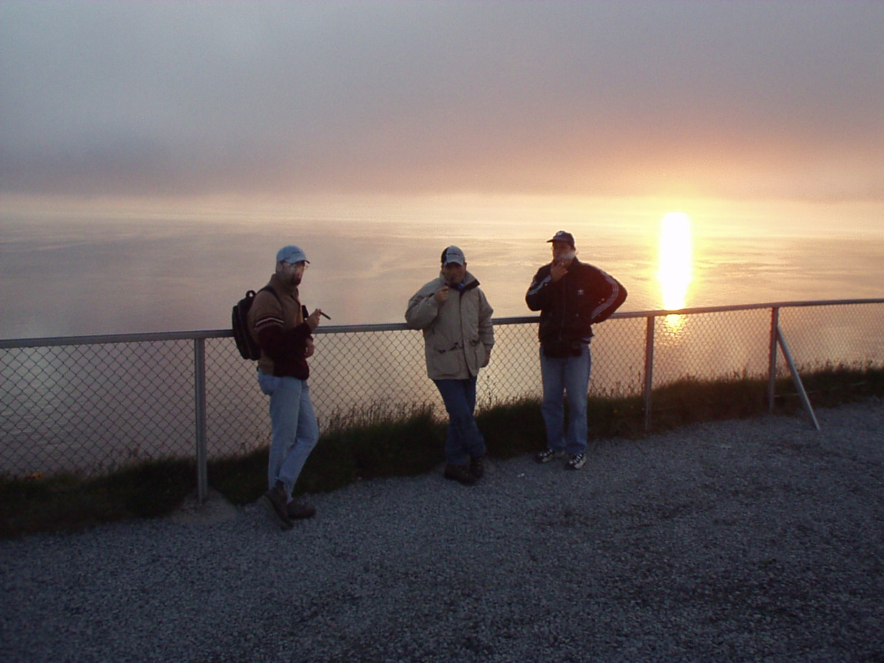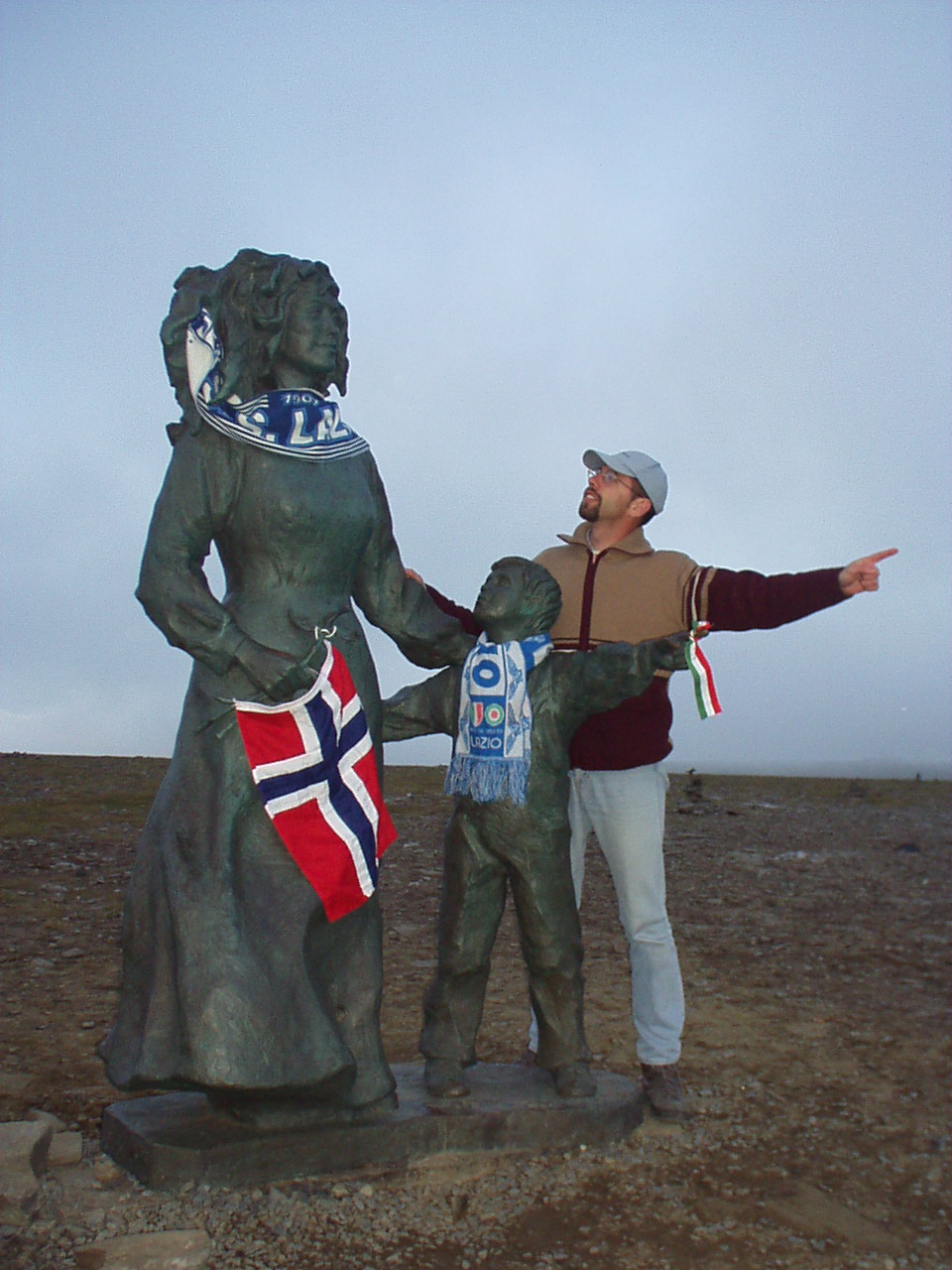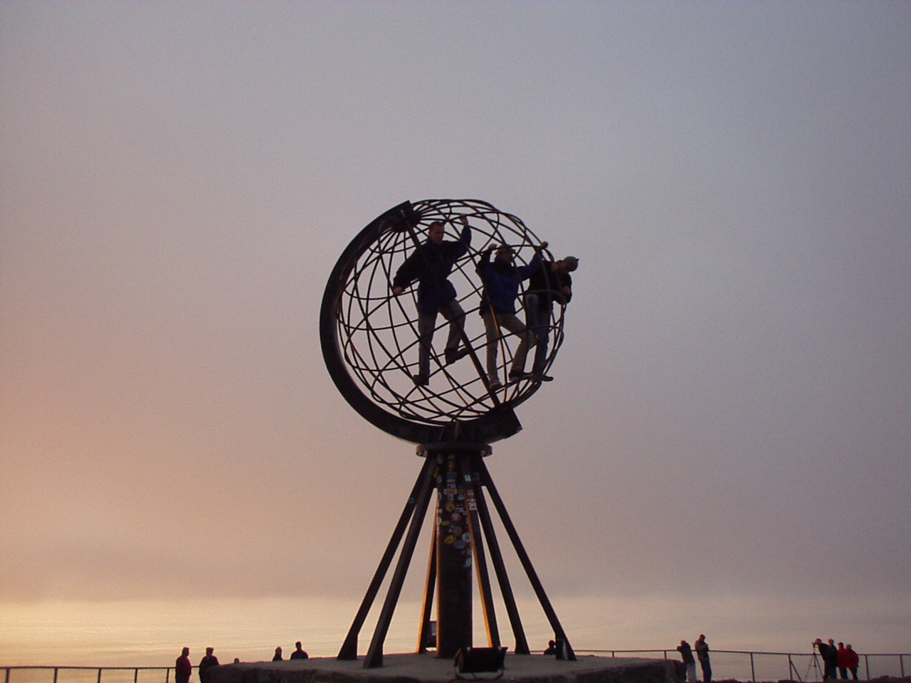 Il cielo è sereno, ma basse nuvole all'orizzonte compromettono una buona visione del sole di mezzanotte. Speriamo che si alzino in tempo... Intanto impazzano i turisti dei pullman, fino alla mezzanotte, poi il piazzale si svuota e rimangono solo quelli che hanno deciso di passare qui la notte. L'aria è piuttosto fresca (eufemismo). Gianfranco sfoggia guanti di pile viola, Ale non ha la giacca a vento né il k-way (né gli occhiali da sole, che paradossalmente non sono del tutto inutili a quest'ora, a queste latitudini). Pippo e Pierluigi sono meglio attrezzati e si fanno notare di meno.