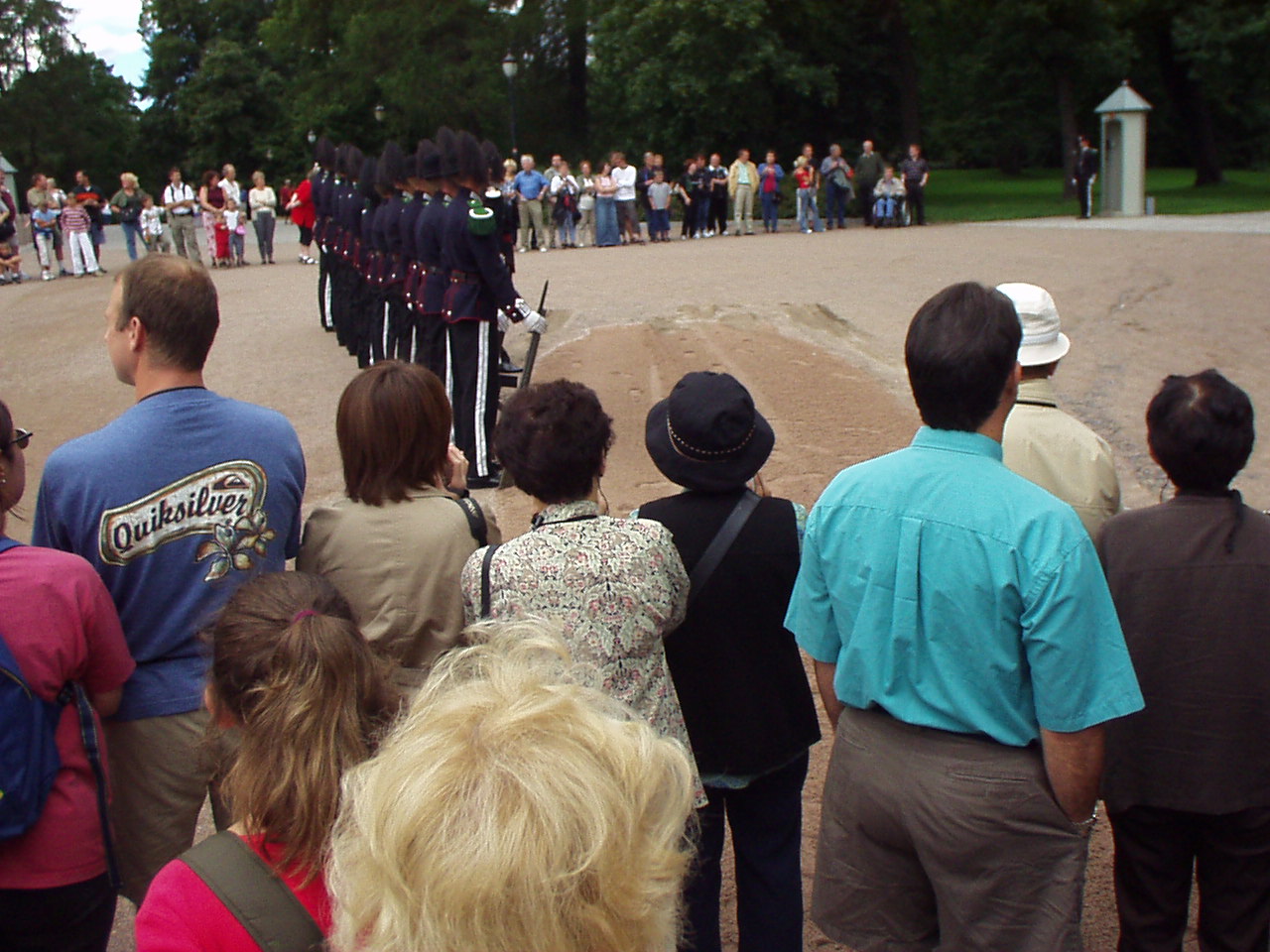 Ci guardiamo intorno avidi di immagini da portarci dietro, cercando fra i parchi, le strade e i visi della gente le cose che più meritano di essere ricordate. Pranziamo lentamente (ma forse è più un brunch che un pranzo, visto l'orario). Tornando all'albergo ci fermiamo al palazzo reale, dato che all'una e mezza c'è il cambio della guardia, che vale la pena di essere visto. Una sentinella si muove (un po' a marionetta, diciamolo pure) davanti all'ingresso, mentre lontano sulla destra c'è il corpo di guardia, nel quale si fanno gli ultimi preparativi. Una piccola folla si è assiepata davanti al portone mentre sul piazzale, incurante di tutto, una ruspa spiana il ghiaino rosso lavato via dalle piogge di questi due giorni. Provate ad indovinare chi c'è in prima fila davanti al portone: