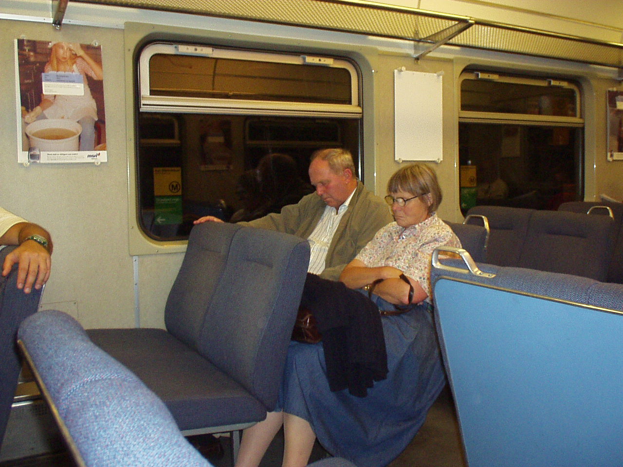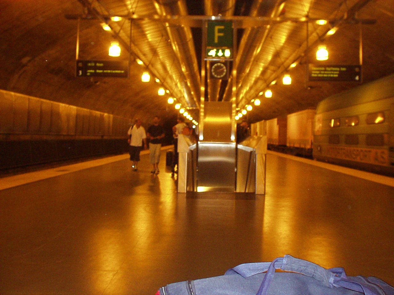 La stazione è di un tipo per noi inconsueto. L'ambiente è ampio (niente a che vedere con i tunnel stretti delle nostre linee), come una vera stazione ferroviaria. Ci sono due binari per ogni direzione (ad accessi separati), sui quali i convogli si susseguono con cadenza incessante. Fatto per noi anomalo è che sulla stessa linea transitano sia la metropolitana che i treni veri e propri (il nostro è un intercity, anche se la definizione sembra esageratamente lusinghiera). Nei pochi minuti di attesa abbiamo anche il tempo di veder passare un treno-merci.