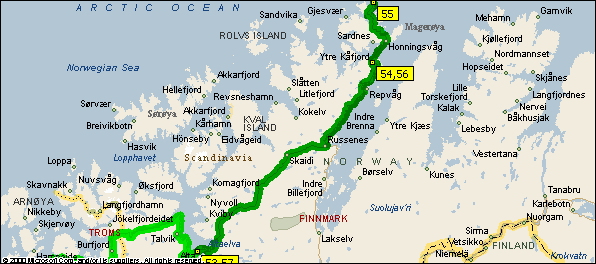 il primo, fino ad Olderfjord, percorre la tundra degli altipiani interni, il secondo si snoda invece lungo il Porsangen, fino al costoso tunnel che porta all'isola di Honnigsvåg. Dall'uscita del tunnel mancano ancora 33 chilometri alla meta (praticamente siamo a Velletri).
